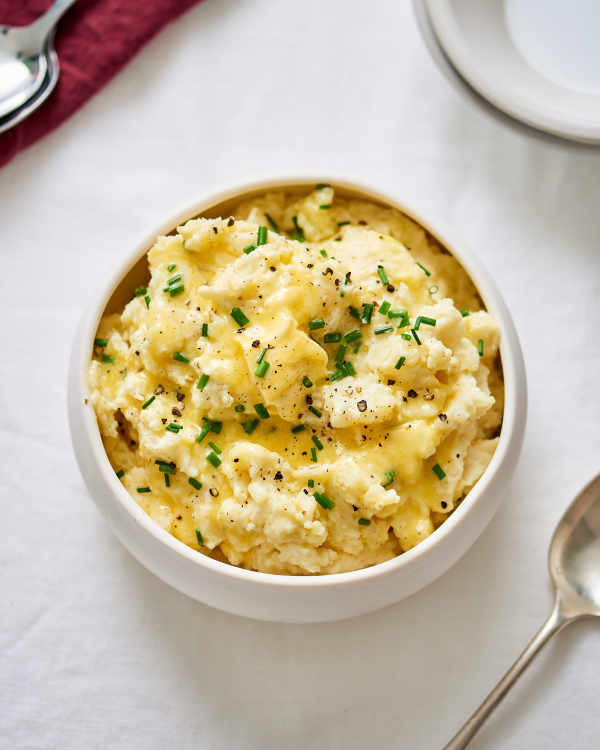 - When ready to serve, spoon into a serving dish and top with chopped chives and a few pats of butter.
